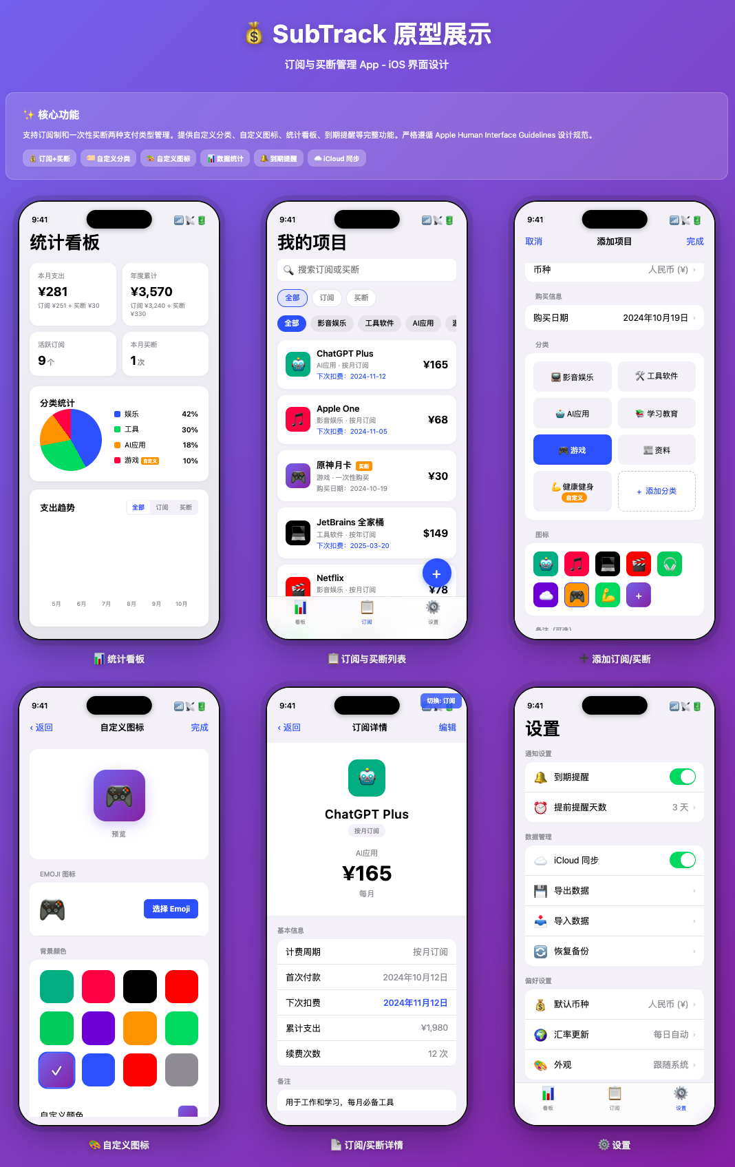 - 核心功能模块包括:订阅/买断管理、统计看板、设置同步等