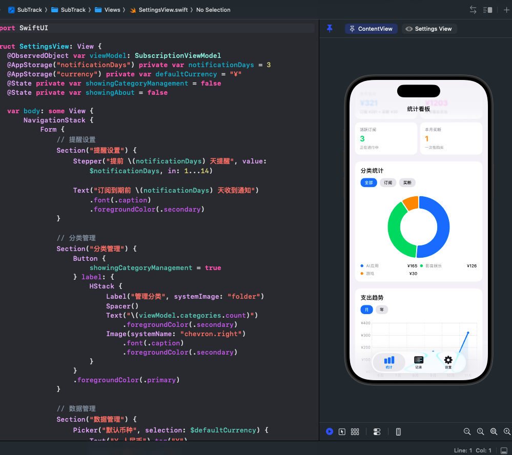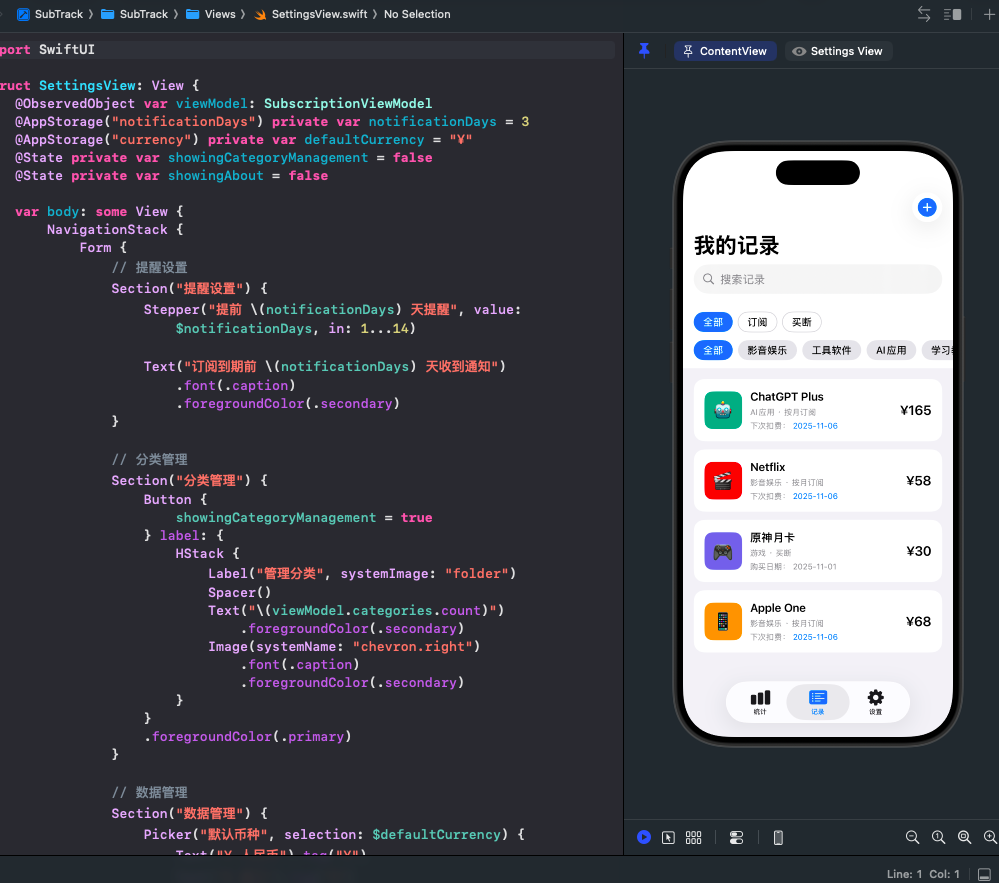 3. 需要使用 SwiftUI 和 UserDefaults 并遵循 MVVM 架构来实现整个 AppCursor 写代码时,我心里还在感叹:“我连 Xcode 都没真正用过,现在居然在写 iOS 应用?”