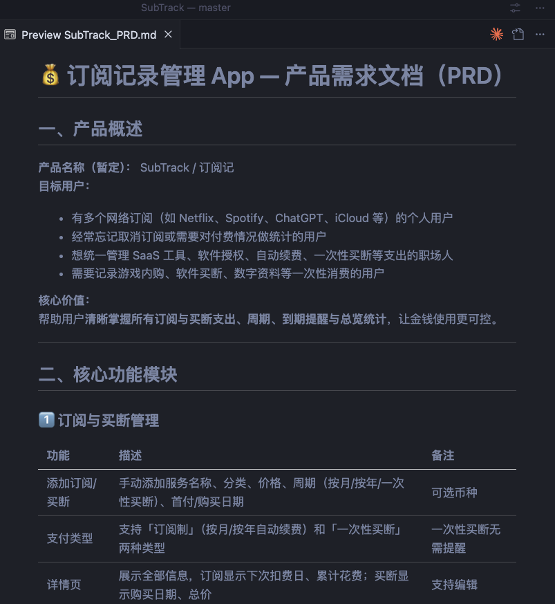 - 生成一份完整的订阅管理 App 的 PRD(产品需求文档)
