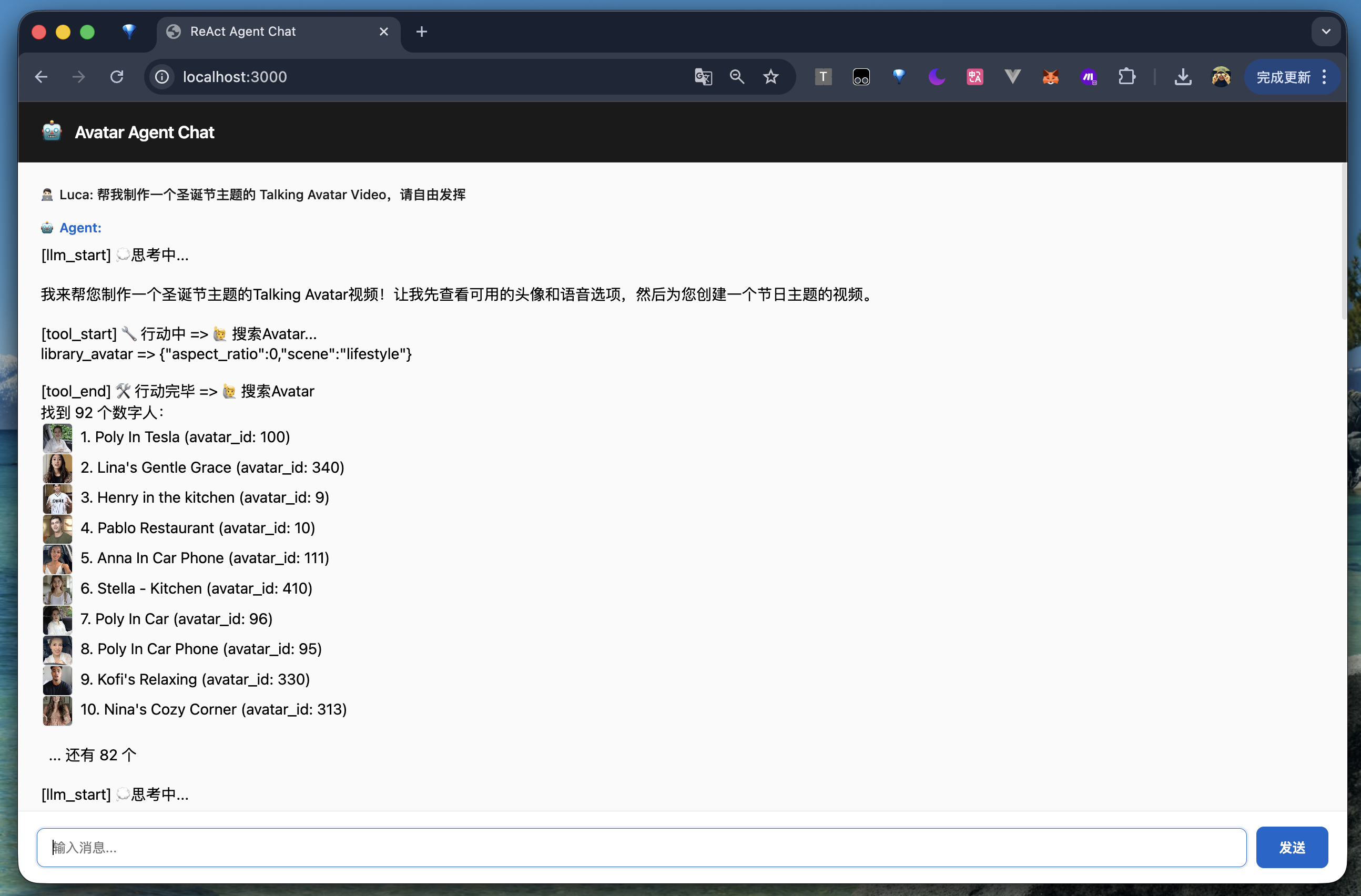 偶尔我会微调 Prompt,比如让视频多点节日气氛,或者要求数字人表现得更激昂。大模型完全理解我的需求,并会通过 Tools 选取符合圣诞节主题的数字人、生成对应脚本、选择带有情绪的 AvatarX 数字人。整个体验就像在指挥一个非常听话的数字助手