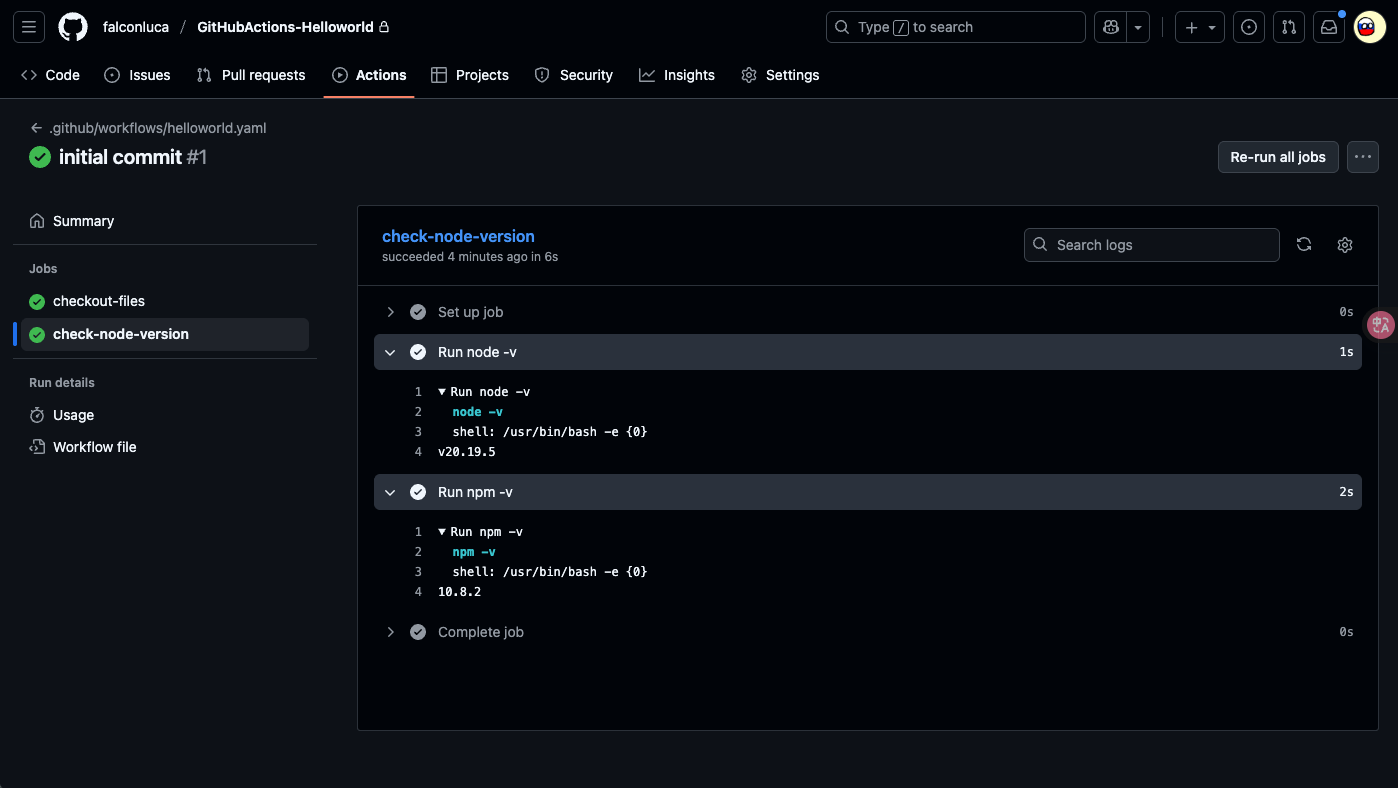 - run: npm -v这个 GitHub Actions workflow 在每次 push 时触发,包含两个 job:第一个 job 会列出当前工作目录和文件(pwd、ls),第二个 job 依赖于第一个,输出 node -v 与 npm -v,用于按顺序验证仓库内容与 Node/npm 运行环境