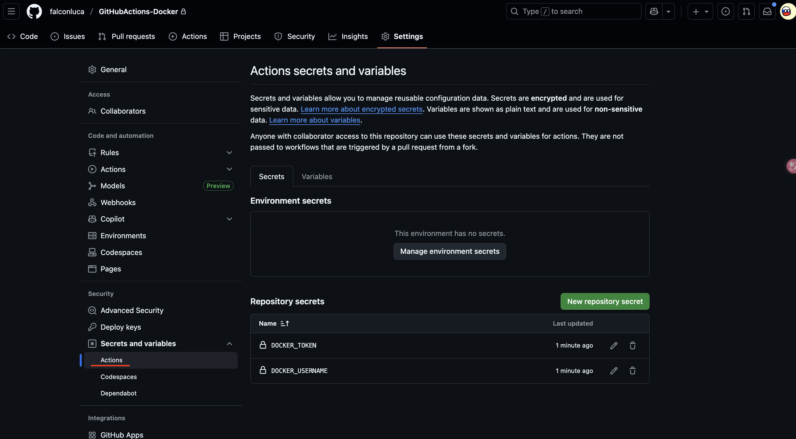 tags: ${{ secrets.DOCKER_USERNAME }}/githubactions-docker:latest在推送代码之前,我们需要先把 DockerHub 配置加到 GitHub Actions 的 Secrets 里: